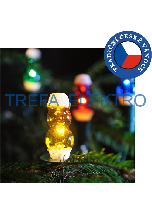 FIGURKA sněhulák barevný, 12 x 20V/0,1A, délka řetězu 7 m, přívod 3m, rozteč mezi žárovkami 60 cm, určen pro střední stromky, uchycení drátkem